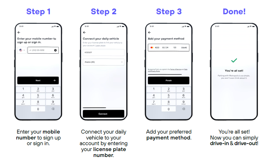 Getting started is as easy as 1-2-3. Signing up before your visit ensures you can simply drive-in, and drive-out. No lines, no hassle. Just follow these simple steps to set up your account and enjoy a truly seamless parking experience!